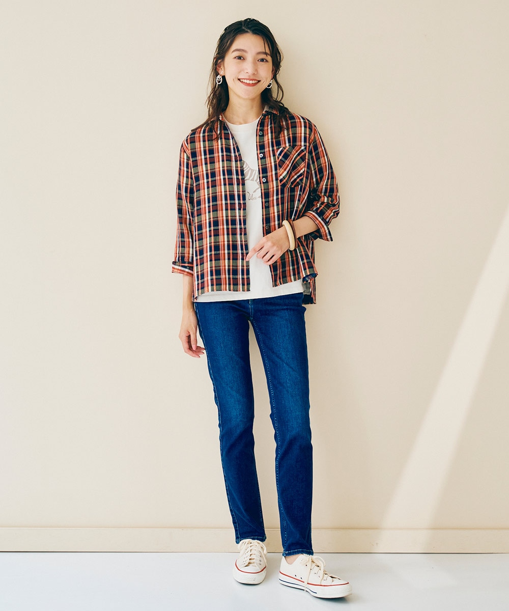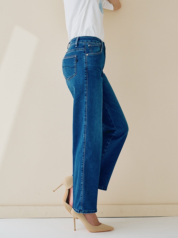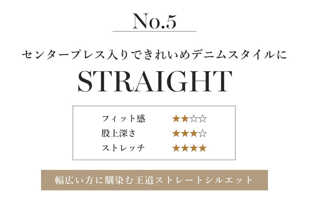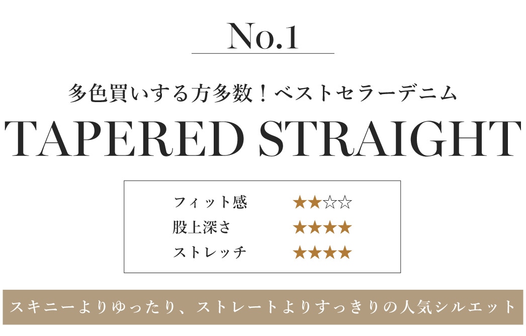 TAPERED STRAIGHT GM3088 ¥15,400 膝下に程よいゆとりを持たせた、脚のラインが出にくくはきやすい王道のストレートデニム。細すぎず太すぎない絶妙バランスで、どんなコーディネートとも合わせやすい優れもの。一度はくとやみつきになる方多数の、ミセスジーナを代表する人気デニムです。 |
