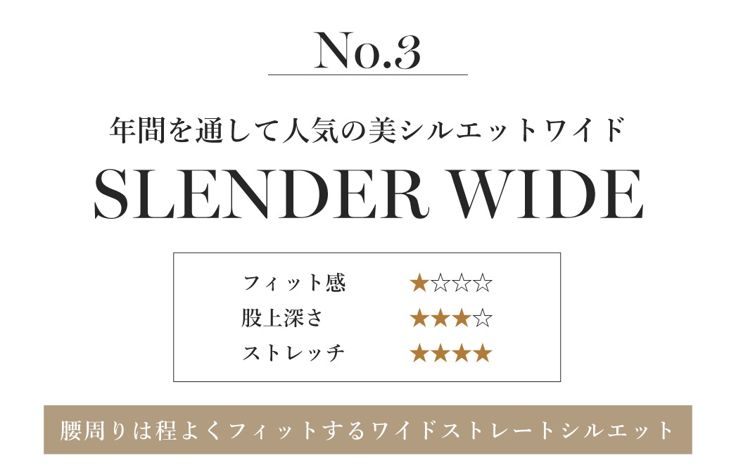 SLENDER WIDE GM3504 ¥15,400 脚のラインを隠しつつもすっきり美脚にみせてくれる、太すぎないスレンダーワイドシルエット。発売以来店頭でも常に上位を誇る大人気デニムです。仕上げに施したセンタープレスでよりスラっとした印象に。 |