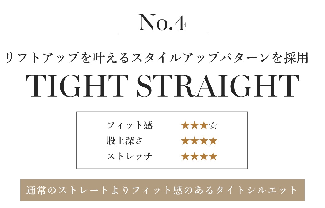 TIGHT STRAIGHT GM3098 ¥15,400 全体的に細身なシルエットで身体を包み込み持ち上げる「リフトアップパターン」を採用し、美シルエットを追求したタイトストレートデニム。華奢な方にもおすすめの55サイズから展開。細身シルエットでも抜群のストレッチ性で疲れないデニムです。 |